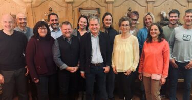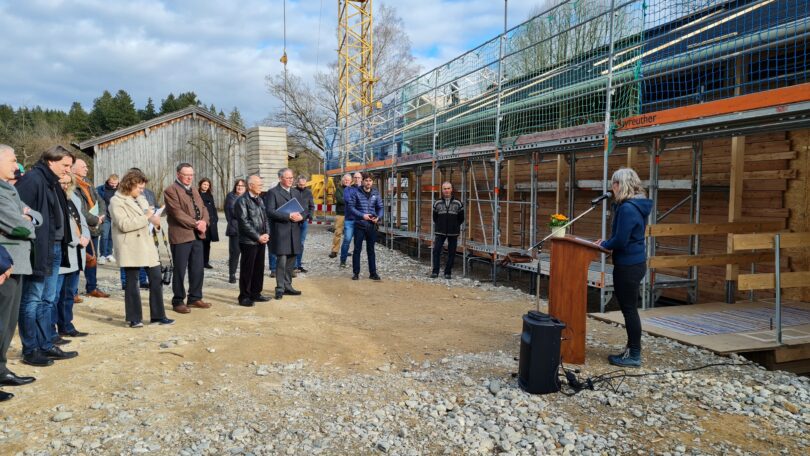 Zimmerer Paul Langbauer sprach bei der Hebfeier den Richtspruch, dankte dem Bezirk Oberbayern als Bauherrn und wünschte dem Bau Glück und Segen. Zuvor hatte Bezirkstagspräsident Thomas Schwarzenberger bereits die Arbeit der Planerinnen und Planer und der beteiligten Gewerke gelobt. Umso mehr, weil es sich bei dem neuen Gebäude nicht um ein gewöhnliches Projekt handelt. Denn, wie Schwarzenberger erklärte: „Die vom Bezirk Oberbayern angestrebte ökologische Bauweise wurde hier so konsequent umgesetzt wie noch nie zuvor beim Bezirk.“ Er nannte als Beispiel die Schraubfundamente und den Lehmboden des neuen Gebäudes. Hier kämen uralte Techniken beziehungsweise Materialen zum Einsatz. „In dem Gebäude wird man kein Bröckerl Zement oder Beton finden“, hob Schwarzenberger hervor.
