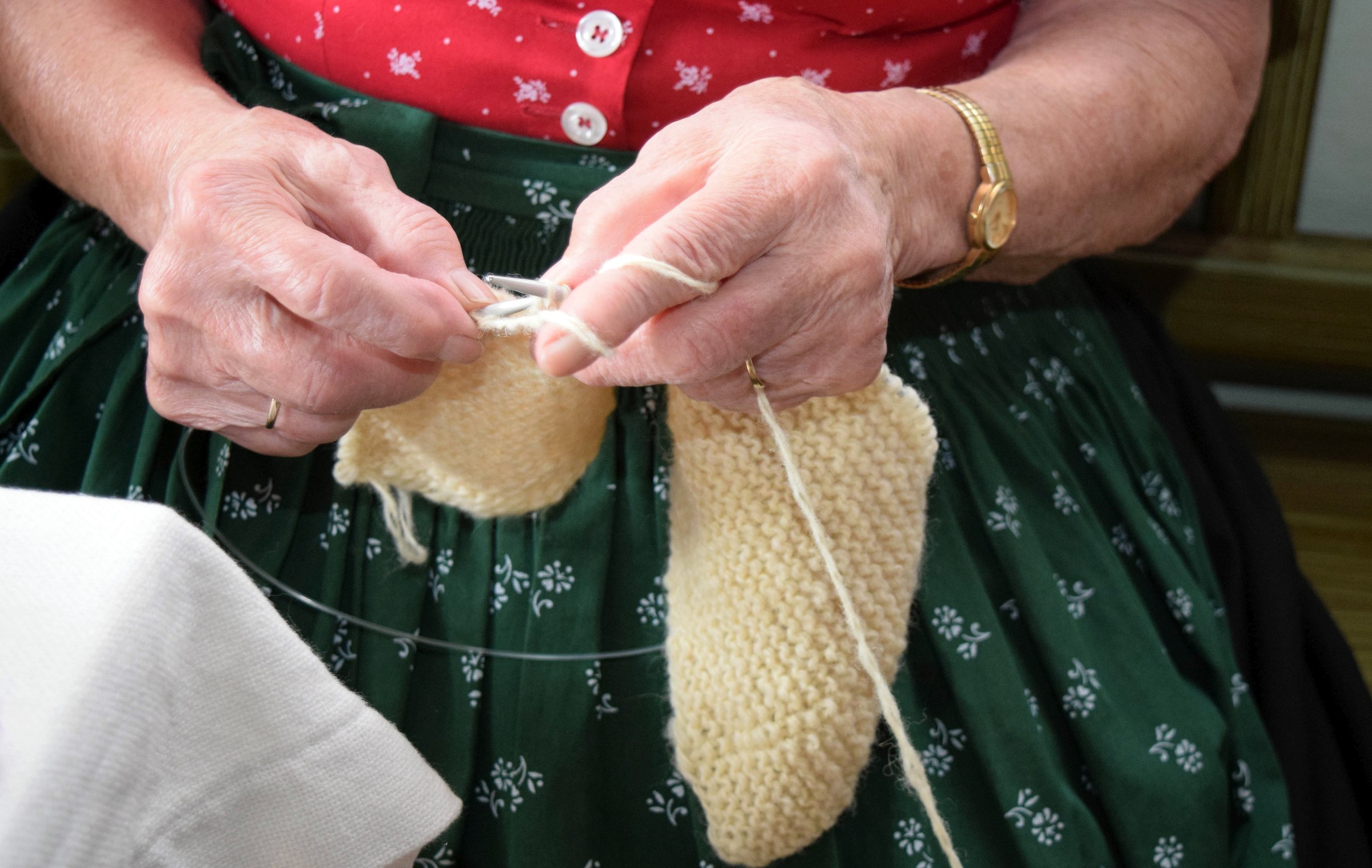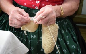 Einfach stricken – rechte und linke Maschen, die beiden Grundarten, ergeben interessante Muster und Kombinationsmöglichkeiten. © Bezirk Oberbayern, Archiv Bauernhausmuseum Amerang.