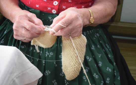 • BHM_Handarbeiten_002.jpg: Beim geselligen Beisammensein in der Stube des Bernöderhofes entstehen wärmende Accessoires für Hände, Arme und Füße. © Bezirk Oberbayern, Archiv BHM.