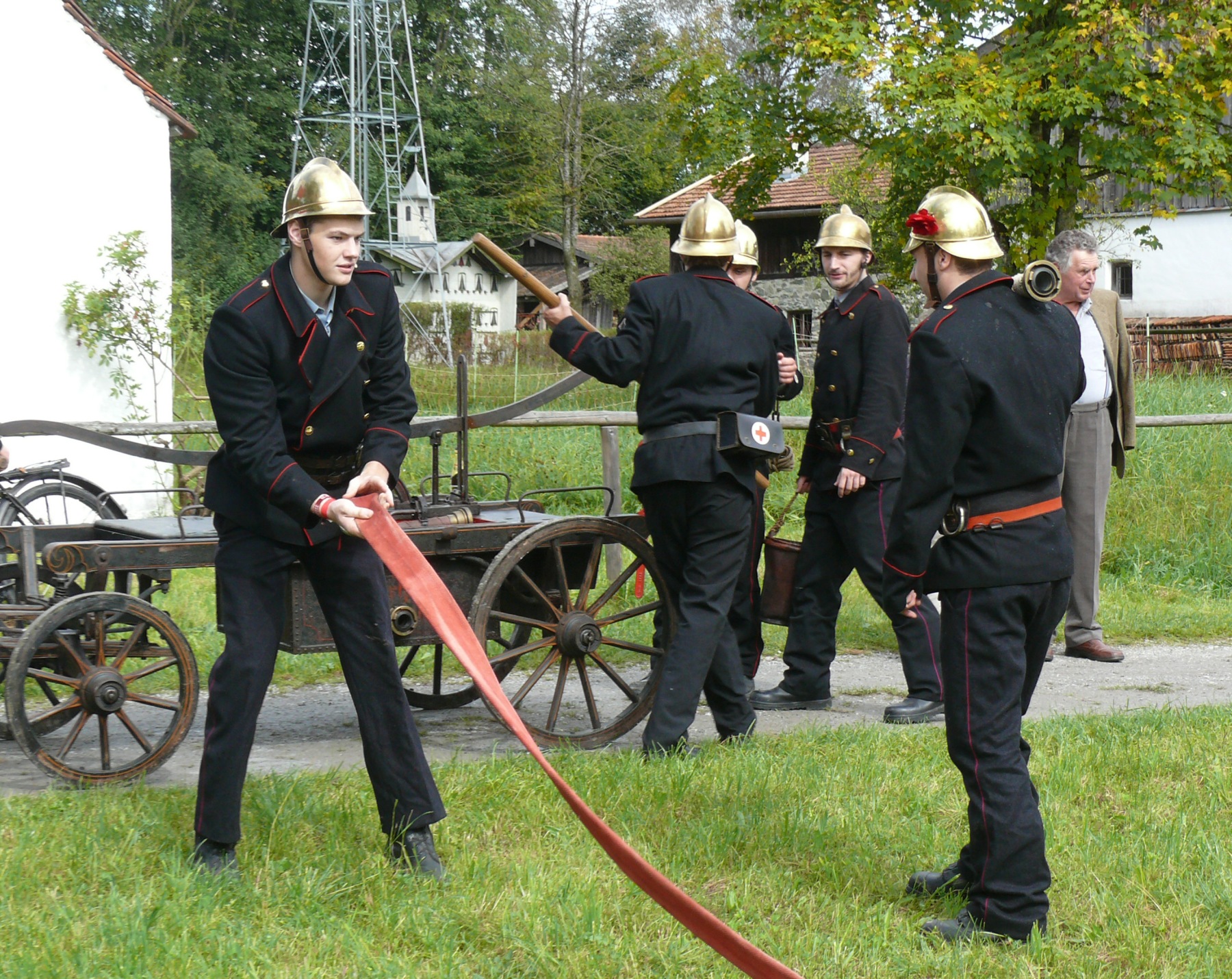 „Wasser marsch!“ – Der historische Spritzenwagen der Feuerwehr Halfing dreht am Sonntag seine Runden im Bauernhausmuseum. © Bezirk Oberbayern, Archiv BHM.