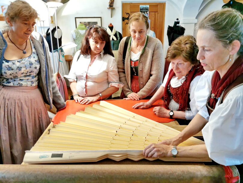 Sticken und Plissieren – ein Besuch bei zwei oberbayerischen Handwerksbetrieben – Wie feinste Handwerkskunst aus Garn und Stoff entsteht, durften interessierte Trachtlerinnen aus dem Loisachgau Ende April bei einem Besuch der Fahnenstickerei Jaeschke und der Werkstatt „Plissee is schee“ von Andrea Schatz erleben.