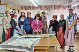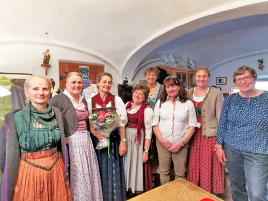 Auf dem Programm des jährlichen Trachtenwartinnen-Ausflugs, zu dem Leni Sappl und Tanja Leitner vom Sachgebiet „Trachtenpflege und Trachtenforschung“ geladen hatten, standen heuer zwei Betriebe, die jeweils noch eine selten gewordene Handwerkskunst beherrschen. Zunächst steuerten die Trachtlerinnen des Loisachgaus die Fahnenstickerei Jaeschke & Zwislsperger in Engelsberg im nördlichen Landkreis Traunstein an. Dort führte Firmenchefin Carmen Zwislsperger durch die 1978 von ihrer Mutter Annemarie Jaeschke gegründete Kunst- und Fahnenstickerei und zeigte den Teilnehmerinnen Schritt für Schritt wie eine neue Fahne entsteht, aber auch wie eine alte Fahne oder sakrale Gewänder restauriert oder konserviert werden können. Bei dem Rundgang durch den traditionellen Handwerksbetrieb, der auch „Textilgestalter im Handwerk im Bereich Stickerei“ ausbildet, konnte man den angestellten Stickerinnen jeweils über die Schulter schauen und Fragen zu den verwendeten Materialien und Sticktechniken stellen. Besonders beeindruckt zeigten sich die Trachtlerinnen sowohl von der handgeführten Maschinenstickerei, bei dem mit einer großen Portion Gefühl die Stichbreite mit einem Hebel während des Nähens eingestellt wird, als auch von der Nadelmalerei, die viel Geduld und Fingerspitzengefühl für die feinen Farbschattierungen von den Stickerinnen erfordert. Bei der interessanten Führung wurde deutlich, dass in den rund 365 Arbeitsstunden für eine neue Fahne auch jede Menge Herzblut steckt. Die Firmenchefin begleitet den Verein von Anfang an persönlich und macht u.a. einen Vorortbesuch für die Motivsuche und stimmt die Motivgestaltung eng mit dem Auftraggeber ab. Schließlich soll der Verein – so Carmen Zwislsperger – am Ende einen „Repräsentationsgegenstand, hinter dem man mit Stolz hergeht“ erhalten.
