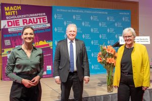 Stiftungsvorsitzender Markus Ferber (M.) mit Bayerns Digitalministerin Judith Gerlach (li.), und Juryvorsitzender Stefanie von Winning (.re.) bei der Preisverleihung DIE RAUTE am 20.12.2021 in München Foto: HSS/Plettenberg