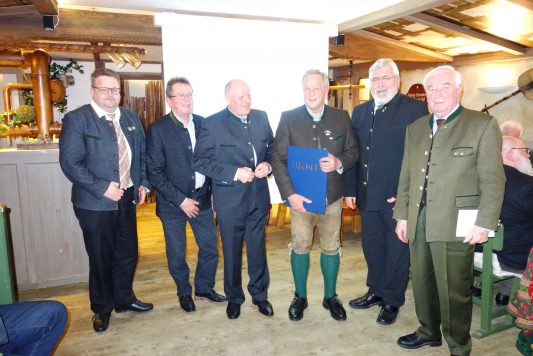 Der derzeit 685 Mitglieder starke Bayernbund im Landkreis Rosenheim hat mit dem aus Oberaudorf stammenden Volks- und Kirchenmusiker sowie Komponisten und Chorleiter Hans Berger ein neues Ehrenmitglied. Den Antrag hierzu stellte Bayernbund-Kreisvorsitzender Christian Glas und er fand begeisterte Zustimmung bei der gut besuchten Jahresversammlung im Gasthaus „Zum Entenwirt“ auf dem Samerberg. Die Laudatio hierzu hielt Adolf Dinglreiter als Ehrenvorsitzender des Landesverbandes. „Du hast in vielen Jahrzehnten und Aufgabenbereichen die Musik und Sprache in unserem Land gefördert und vorbildhaft weitervermittelt“, so Dinglreiter zu Hans Berger, der sich unter anderem als Organist und Zithervirtuose sowie beim Notenschatz des Müllner-Peter von Sachrang große Anerkennung und Verdienste erworben hat. 1985 gründete er das Müllner-Peter-Ensemble, mit seinen Konzerten und Singspielen erfreute Hans Berger ebenso wie mit den Alpenländischen Marien- und Weihnachts-Oratorien mit Aufführungen weit über den Landkreis Rosenheim hinaus. „Die Bayerische Staatskanzlei, der Bayerische Rundfunk und kirchliche Würdenträger bis zum Vatikan haben Deine Leidenschaft und Dein Gespür für Bayern sowie Deine vielen musikalischen Talente wahrgenommen und an Deinen Veranstaltungen Freude gefunden“, sagte Adolf Dinglreiter weiter. Und Hans Berger dankte nach der Übergabe einer großen und schönen Ehrenurkunde mit den Worten: „Als ich als Bergbauern-Sohn und Musik-Student vor 44 Jahren dem Bayernbund beitrat, war ich froh, Gleichgesinnte zu finden, die mit der Heimat verwurzelt sind und die ihre Dankbarkeit für das Leben in ihrer Heimat zeigen indem sie sich ehrenamtlich für Brauchtum, Musik, Sprache und Zusammengehörigkeit einsetzen“. Damit dieses Ansinnen auch zukünftig eine Fortentwicklung erfahren kann, planen Bayernbund und Hans Berger als neues Projekt Kinderchöre und Chorleiter zu fördern, um diese noch mehr als bisher am reichen Musik- und Notenschatz aus der Region teilhaben zu lassen.