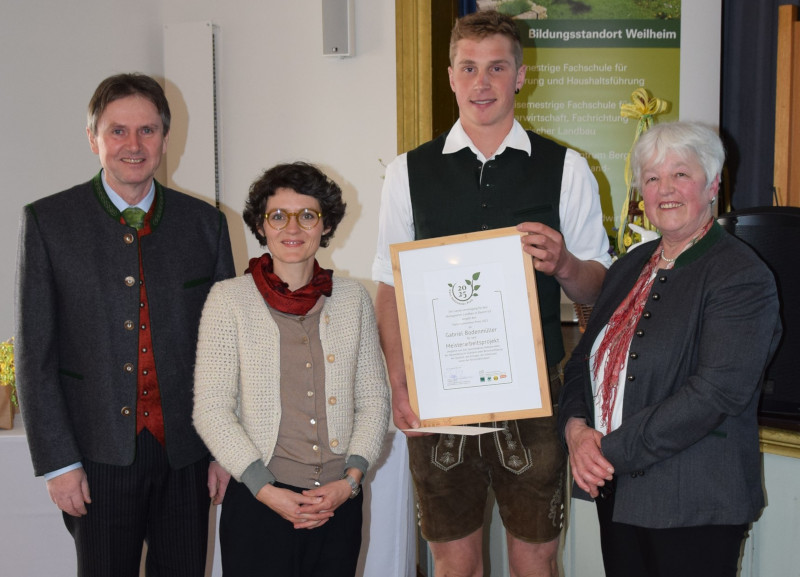 Freuen sich über den Hans-Hohenester-Preis bei der Schulschlussfeier der Öko-Fachschule in Weilheim: Stefan Gabler (Schulleiter Öko-Fachschule Weilheim), Teresa Lukaschik (LVÖ), Preisträger Gabriel Bodenmüller, Agnes Edenhuber (Jurymitglied und Laudatorin). Foto: AELF Weilheim