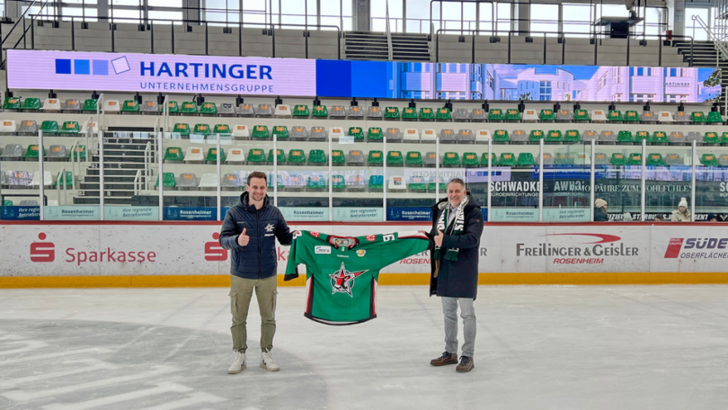 Pressemitteilung Starbulls Rosenheim e.V. Michael Hartinger, Geschäftsführender Gesellschafter, der Hartinger Unternehmensgruppe gemeinsam mit Darwin Kuhn (Sponsoring Leiter Starbulls Rosenheim)/ Copyright: Starbulls Rosenheim e.V.