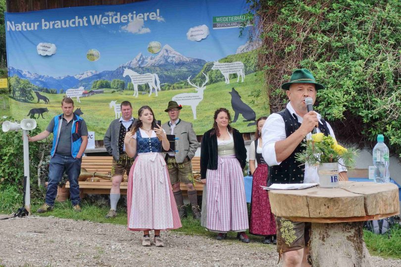 In einem weiteren Grußwort stellte Bürgermeister Ludwig Entfellner das Hochgerngebiet und seine Gemeinde Unterwössen vor. „Ursprünglich hatte unsere Gemeinde 75 Almen, 45 werden heute noch bestoßen. Die Land- und Almwirtschaft spielt in unserer Zeit und Gemeinde mit Zuzugsdruck eine zentrale Rolle. Leider findet die Leistungen zugunsten unserer Kulturlandschaft von Bäuerinnen und Bauern über Generationen hinweg bei der Bevölkerung zu wenig Verständnis“, so der Bürgermeister, der zum Raubtier Wolf sagte: „Einzäunen heißt Auszäunen, aber nicht nur gegenüber dem Wolf, sondern auch gegen den Menschen. Der Wähler am Mittleren Ring in München soll nicht die Alm-Politik bestimmen, es wird bei weiteren Veränderungen zu keinem Bauernaufstand kommen, aber schleichend werden wir uns von dem geordneten Almlandschaftsbild verabschieden müssen“. Auch Landrat Siegfried Walch vom Landkreis Traunstein würdigte die Leistungen der Almbauern und Forstleute indem er sagte: „Alm-Wirtschaft ist gelebter Naturschutz“.