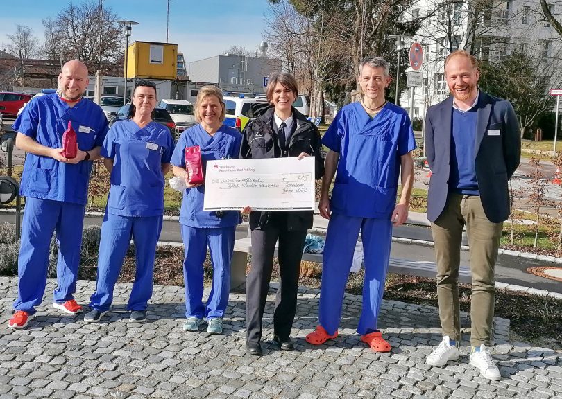 „Wir möchten uns für den unermüdlichen Einsatz aller Beschäftigten bedanken, die sich in der Hochphase der Pandemie um die vielen Corona-Patienten kümmern und dabei an ihre psychischen und physischen Belastungsgrenze gehen müssen“, erklärt Patrizia Kaiser, Pressesprecherin des Hauptzollamtes Rosenheim (3.v.r.). Aus diesem Grund ergriff sie vor einigen Wochen die Initiative und rief in ihrem Kollegenkreis eine Spendenaktion für die Intensivstationen des Klinikums ins Leben. „Das Interesse war riesig“, erzählt sie, „und schnell waren rund 700 Euro beisammen.“