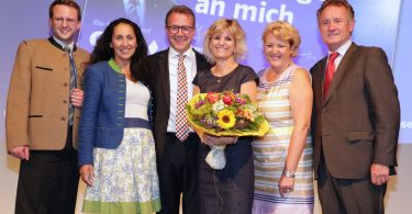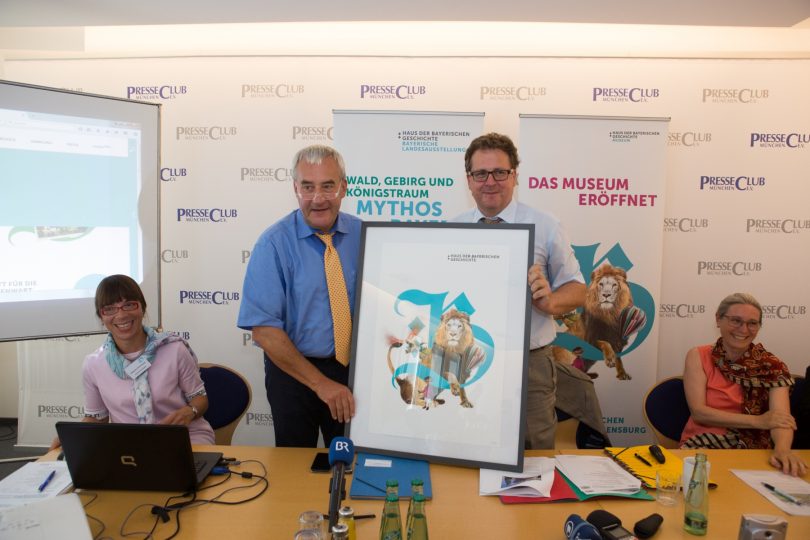 Kultusminister Dr. Ludwig Spaenle (Mitte links) und der Direktor des Hauses der Bayerischen Geschichte Dr. Richard Loibl (Mitte rechts) stellten umrahmt von Natascha Zödi-Schmidt (links) und Dr. Margot Hamm (rechts) am 17.07.2017 im Münchner Presseclub die zwei zentralen Beiträge zum Jubiläumsprogramm des Freistaats Bayern im Jahr 2018 vor: Die Bayerische Landesausstellung „Wald, Gebirg und Königstraum – Mythos Bayern“ und das Museum in Regensburg am Donaumarkt.