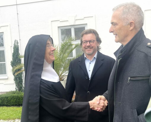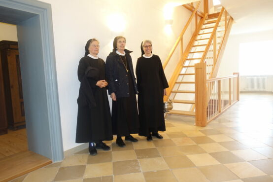 „Warum ist uns das Haus Scholastica so wichtig?“ – diese Frage gleich zu Beginn beantwortete die Äbtissin selbst mit den Worten: „Das Haus Scholastica ist eines der ältesten Gebäude in unserem Kloster-Ensemble, es ist ein Kulturgut, das Menschen zum Gebet, zur Einkehr und zur Neuorientierung einlädt. Die Gastfreundschaft ist ein Hauptpostulat des Heiligen Benedikt, dem Gründer unseres Ordens“. Und sie fügte hinzu: „Ohne Gottes Hilfe hätten wir dieses herausfordernde Projekt nicht stemmen können, denn: Wenn der Herr nicht das Haus baut, dann arbeiten umsonst, die daran bauen!“. Pfarrer Konrad Kronast (Jahrgang 1937), der bereits als Jugendpfarrer von Rosenheim vor 50 Jahren mit Jugendlichen zu Besinnungstagen im Haus Scholastica zu Gast war, erinnerte beim Gottesdienst in seiner Predigt an die Wohltaten des Heiligen Benedikt und seiner Schwester Scholastica wenn es um die Gastfreundschaft ging und sagte: „Die Pflege der christlichen Gastfreundschaft ist ein Merkmal des Mönchtums, sowohl bei Mönchen und Nonnen. Im Gast kann Christus selbst zugegen sein, jeder Fremdling sollte im Namen Gottes in Form von Dienen, Hinhören und Sehen aufgenommen werden. Möge das neue Haus dazu helfen, in Stille und im Gebet sich selbst neu zu finden, Kraft zu schöpfen und gestärkt in den Alltag zurückzukehren“.