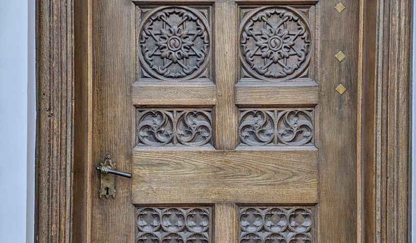 Die Türe ist in sechs verschieden große Türfüllungen unterteilt und mit unterschiedlich gestalteten Schnitzereien geziert. Die Schnitzmuster sind wiederum in verschieden große runde Formen gegliedert, sodass sich daraus eine schöne Einheit ergibt. Beim oberen Türabschluss ist eine ebenfalls geschnitzte Zierleiste angebracht. Auch hinter der Oberlichte aus Glas befinden sich Schnitzereien in den passend runden Formen. Mit den länglichen Profilleisten am Türstock und dem ausgesetzten Rauputz um den Türrahmen ergibt sich ein schönes Gesamtbild. Das Gebäude mit der beschriebenen Türe wurde laut Frasdorfer Höfebuch vermutlich um 1812 erbaut und aus dieser Zeit könnte auch die schön gearbeitete, gut erhaltene und gepflegte Haustüre stammen.