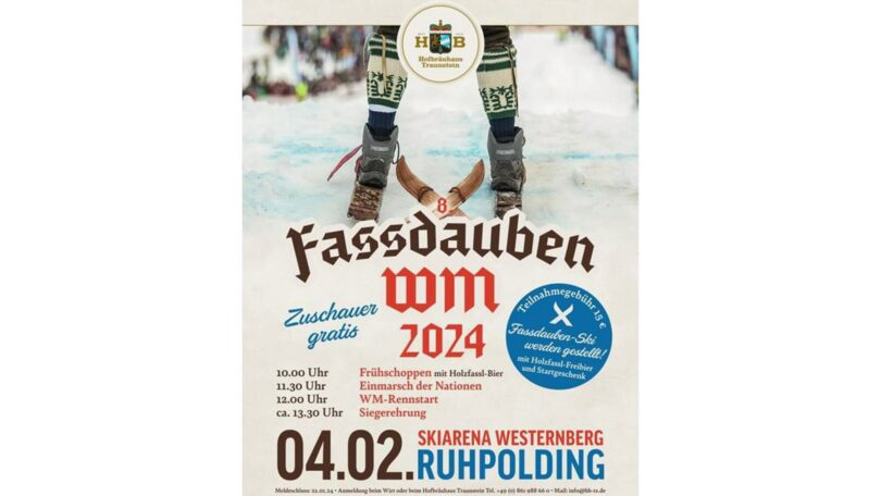Nach dem Schneemangel im letzten Jahr kann die Fassdauben-WM 2024 vom Hofbräuhaus Traunstein in der Ski-Arena am Westernberg in Ruhpolding am 4. Februar 2024 stattfinden. Es werden 600 Starter erwarter.