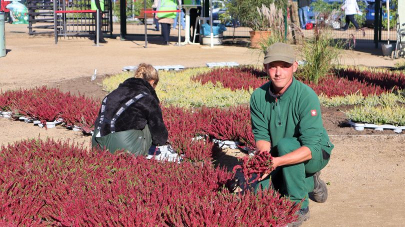 Es sind viele unterschiedlich farbige Heidepflanzen, die aus dem 40 Quadratmeter großen Beet am LAGA-Haupteingang einen herbstlichen Blütenteppich weben. Genau gesagt pflanzen Gärtner Matthias Ehrmann und sein Team an diesem Oktobertag 1200 Eriken und Gräser im Muster einer großen Zielscheibe in den Kreis. „Jetzt ist die perfekte Pflanzzeit für die Heidepflanzen, die den Herbst und den Winter über ein tolles Bild abgeben werden“, sagt Matthias Ehrmann.