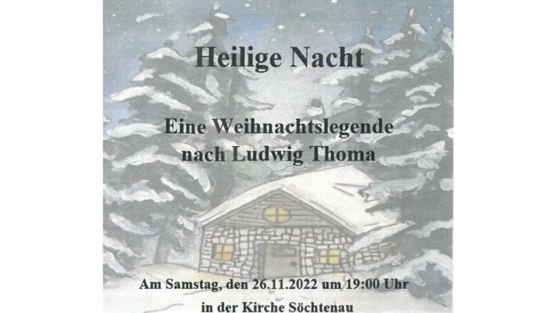 Die Weihnachtslegende “Heilige Nacht” nach Ludwig Thoma wird am Samstag, 26. November, 19 Uhr von Norbert Zehrer in der Kirche Söchtenau gelesen. Der Kinderchor, der Söchtenauer Dreigsang und die Söchtenauer Adventsmusik sorgen für eine musikalische Umrahmumg mit einer Einstimmung in die “Stade Zeit”.