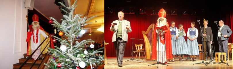 Hans-Dieter Dummert war es auch, der mit Pfarrer Schießler den bereits früher bestandenen Kontakt wieder aufnahm, als er von dessen Besuch in Prien hörte. „Da kam mir die Idee, dass es gerade am Nikolaus-Vorabend passend wäre, den Nikolaus sprechen zu lassen“ – so Dummert, der bereits seit 53 Jahren in Prien das Ehrenamt des Bischofs Nikolaus ausübt und er ergänzte: „In all meinen Jahren besuchte ich ca. 2.900 Familien vor allem in Prien, Rimsting, Bernau und Bad Endorf. Aber nicht nur Familien, viele Vereine, 37 Jahre den Katholischen Kindergarten St. Irmengard, Gottesdienste oder das Altenheim“. Aus seinen Erfahrungen erzählte der Nikolaus einige lustige Anekdoten sehr zur Erheiterung des Publikums. Spontan beteiligte sich Pfarrer Schießler an der vergnüglichen Unterhaltung und sagte: „Ein Bildnis vergess ich nie: das zeigt wie ein Nikolaus am Boden liegt und der Bub danebenstehend mit der Rute sagt: ER hat angefangen!“. Eindringlich und in Versen warnte der Nikolaus, sich in einer schnell gewordenen Zeit nicht von Hetze, Konsumzwang und Leistungsdruck ablenken zu lassen, sondern vielmehr für Fürsorge und Frieden im eigenen Lebensbereich zu sorgen.