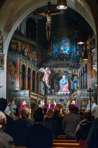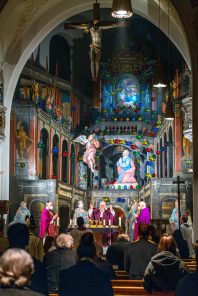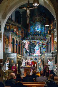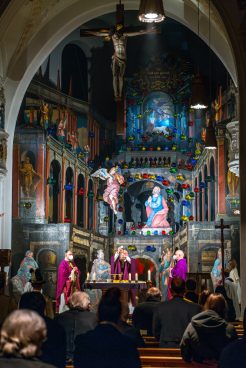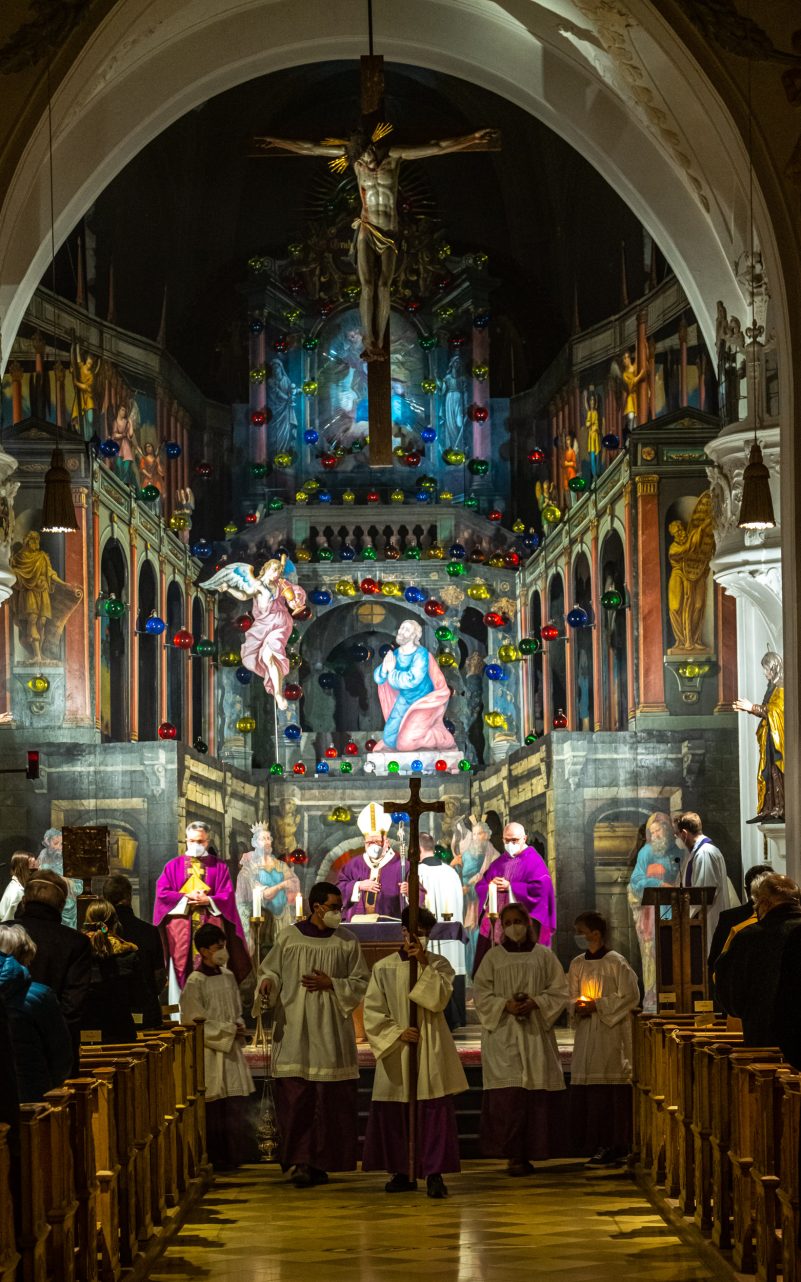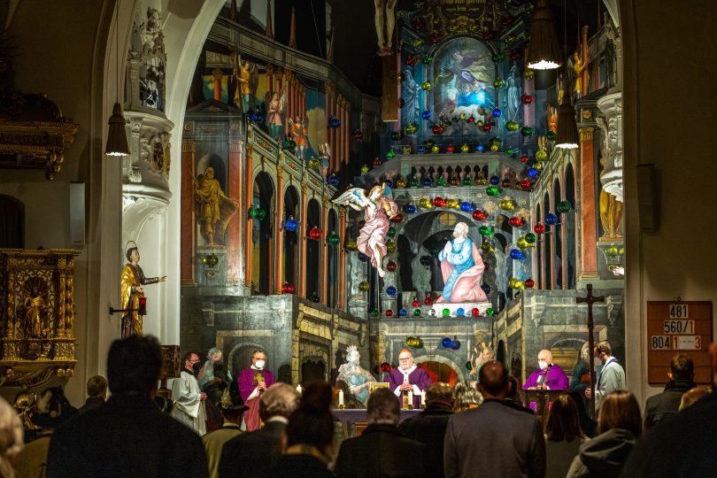 Kardinal Marx feiert Messe zur Aufstellung von barocker Passionsdarstellung und moderner Lichtkunst.