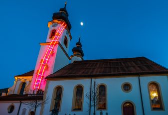 Kunstinstallation „Himmelsleiter“ am Nordturm der Aschauer Kirche vom Künstler Erwin Wiegerling