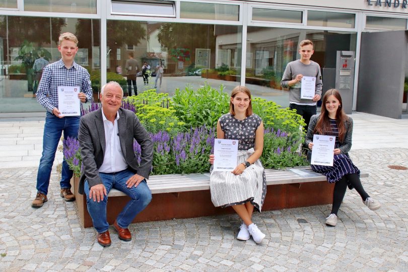 Bericht und Foto: Landratsamt Rosenheim –  Vier von insgesamt neun Preisträgern beim diesjährigen Schülerwettbewerb „Heimat erleben“ konnten im Landratsamt von Kulturreferent Christoph Maier-Gehring ihre Urkunden und Preisgelder entgegennehmen: Von links Paul Fornoff vom Ignaz-Günther-Gymnasium, Kulturreferent Christoph Maier-Gehring, Emma Heimbeck und Konstantin von dem Knesebeck vom Ignaz-Günther-Gymnasium und Clara Bergmann von der Max-Joseph-Grundschule Großkarolinenfeld.