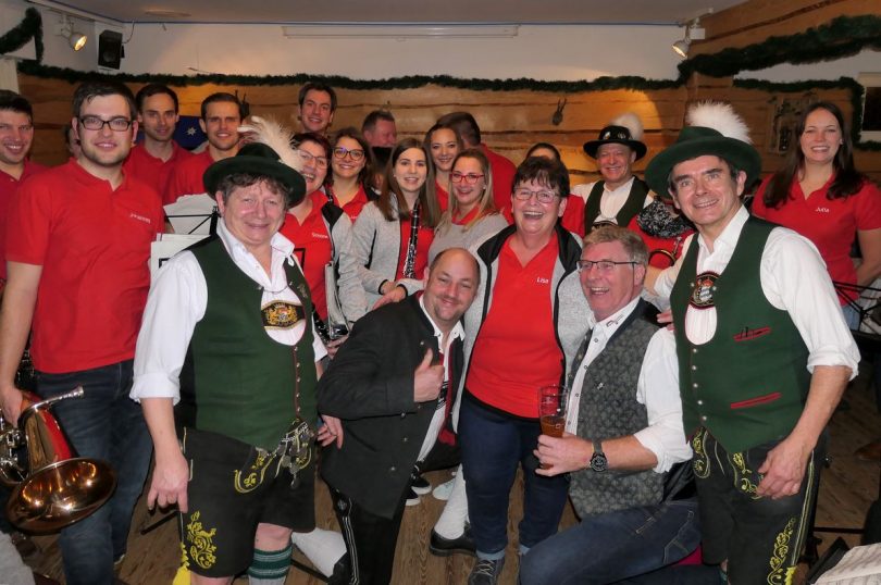 Aus dem Inngau war der Gebirgstrachten und Erhaltungsverein d`Wendlstoana Bruckmühl e.V. mit fast dem ganzen Vorstand vertreten. Allen voran Michael Greiner (1. Vorstand.) und Margret Hinteregger (2. Vorstand). Dabei waren dann noch Sandra Treff (1. Kassiererin), Erika Spohn (1. Schriftführerin), Sophie Neumaier (1. Jugendleiterin), Johanna Liewald (2. Jugendleiterin), Vroni Neumaier (1. Dirndlvorsteherin), Magdalena Rumpel (1. Musikwartin), sowie Matthias Ahrens (1. Vorplattler), der die Berlin-Reise des Vereins auch organisiert hat. Sogar den Fähnrich Markus Seidl haben sie mitgebracht, allerdings ohne Fahne. Er hat jedoch zu später Stunde die Almhütte mit einer „Fahne“ wieder verlassen.