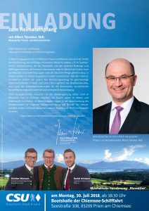 Die interessierte Bevölkerung ist eingeladen, beim Heimatempfang mit dem bayerischen Finanz- und Heimatminister Albert Füracker, MdL am Montag, 30. Juli 2018, um 18.30 Uhr in der Bootshalle der Chiemsee-Schifffahrt (Seestraße 108, 83209 Prien am Chiemsee) dabei zu sein.