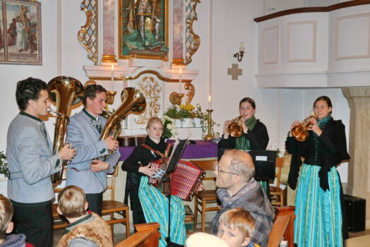 Während es draußen trotz schneidender Winde einfach nicht Winter werden will und nach wie vor nichts nach alpenländischer Weihnacht aussieht, saßen die Wildenwarter bei Kerzenlicht heimelig in der Kirche und lauschten der Musik und dem Gesang der heimischen Sänger und Musikanten. Nach der Corona-Pause fand in der Christkönigskirche von Wildenwart wieder einmal das ersehnte Adventsingen statt. Zwei Dutzend Musikanten haben sich rund um den Wildenwarter Kirchturm in mehreren Gruppen zusammengefunden, die dieses Adventskonzert gestalteten können. Die Wildenwarter Alphornbläser empfingen die Kirchgänger schon vor dem Gotteshaus mit ihren Instrumenten. Die dorfeigenen Musik- und Gesangsgruppen waren auch in diesem Jahr mit dabei: der Wildenwarter Kirchenchor, die Huber-Dirndl, die Rosenwink-Musi, die Wildenwarter Weisenbläser, die Kramer-Musi aus Prutdorf und Helmut Rosenwink an der Orgel, zwei Dutzend Kinder brachten mit Blick auf das herannahende Fest ein Hirtenspiel mit der heiligen Familie, mit Hirten und ihren Schafen, mit vielen Engerln und allem, was ein Hirtenspiel sonst noch so braucht. Verbindende und besinnliche Worte sprach Kläre Hötzelsperger.