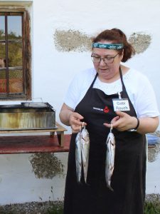Da steigt die Vorfreude: Gabi Rauch erklärt, wie man mit einem Angler-Expressgerät Forellen, Karpfen und Lachs räuchert. © Bezirk Oberbayern, Archiv BHM, Aufnahme: Rosi Raab.