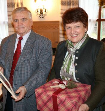 Die Vorsitzende des Helferkreises für die Diözese Ternopil – Ukraine Katharina Schmid gratuliert ihrem Stellvertreter Fritz Tischner zum 80. Geburtstag und überreicht ihm die Urkunde des Erzbischofs der Erzdiözese Ternopil-Zboriv/Ukraine Vasyl Semenyuk.