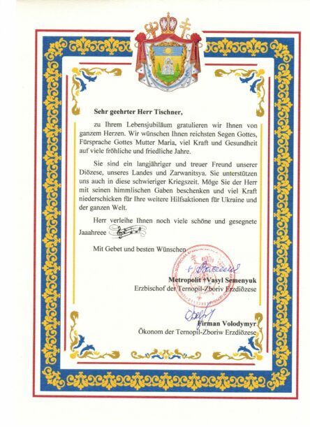 Ungewöhnliche Post erhielt der zweite Vorsitzende des Helferkreises für die Diözese Ternopil – Ukraine und Altbürgermeister von Rohrdorf Fritz Tischner zu seinem 80. Geburtstag. Der Erzbischof der Erzdiözese Ternopil-Zboriv/Ukraine Vasyl Semenyuk gratulierte dem Jubilar zum Jubelfest. Die Vorsitzende des Helferkreises Katharina Schmid überreichte ihrem Stellvertreter die weitgereiste bischöfliche Urkunde im Rahmen einer kleinen Feier mit den Mitgliedern der Vorstandschaft im Cafe Pauli in Höhenberg.