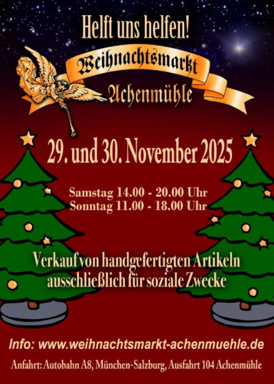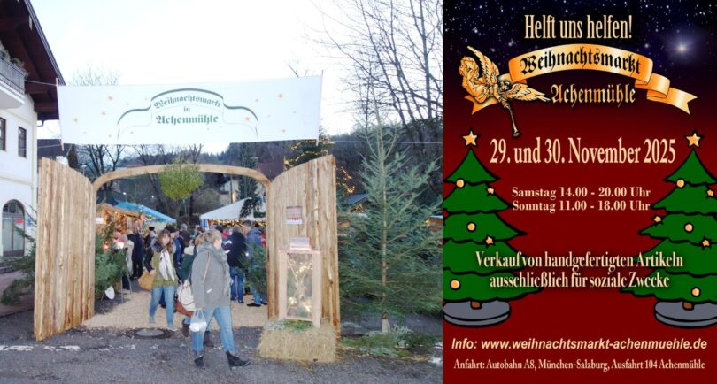 Der Weihnachtsmarkt “Helft uns Helfen” im Rohrdorfer Gemeindeteil Achenmühle wird heuer am Samstag, 29. und am Sonntag, 30. November angeboten.