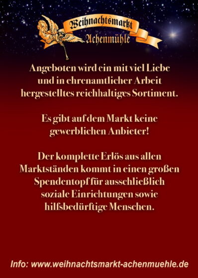 Weitere Informationen: www.weihnachtsmarkt-achenmuehle.de