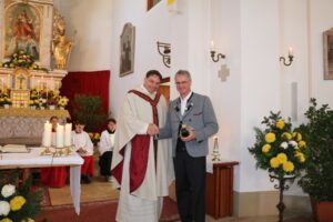 Pfarrvikar Gottfried Grengel (links) bedankte sich beim Festgottesdienst zum Patrozinium der Wildenwarter Christkönigskirche im Namen der Pfarrgemeinde und des Kirchenchores bei Helmut Rosenwink für seine 40-jährige Mitarbeit im Gotteshaus als Organist.