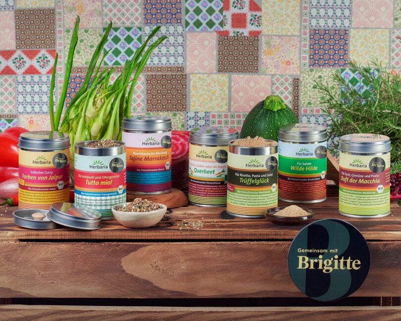 Bislang beinhaltete das BRIGITTE-Kooperationssortiment fünf Gewürzmischungen aus den Bio-Feinschmecker Länderlinien Deutschland, Mediterran, Orient und Asien von Herbaria. Zwei weitere hochwertige Bio-Feinschmecker Gewürzmischungen kommen 2023 hinzu. Neu mit dabei ist das mediterrane Gewürzsalz „Trüffelglück“ – es enthält sechs verschiedene Edelpilze, Edelkastanie und Trüffel und ist vielseitig in der Küche einsetzbar, zum Beispiel für Risotto, Pasta, Schmorgerichte und Salat. Zusätzlich ausgewählt wurde außerdem aus der Bio-Feinschmecker Linie „Hausgemacht“ die salzfreie Gewürzmischung „Tutto mio!“ für Antipasti und Ofengemüse und zum Marinieren oder Einlegen von Pilzen und Gemüse. Sie enthält unter anderem Bio-Koriandersamen aus Unterfranken, die als Einzelgewürz in der Linie Bio-Feinschmecker Basics von Herbaria im Jahr 2021 als „Bayerns Bestes Bioprodukt“ (Bronze) ausgezeichnet wurden.
