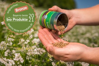 Wir suchen nicht nur die Besten, sondern die Besten der Besten ­– und wenn möglich aus regionalem Anbau. So lautet der hohe Anspruch des oberbayerischen Bio-Gewürz-Herstellers Herbaria an seine Rohstoffe in 100 % Bio-Qualität. Dass dies gelingt, bestätigt nun offiziell die Prämierung der Herbaria Bio-Koriandersamen aus Unterfranken im Wettbewerb „Bayerns beste Bio-Produkte 2021“ in der Kategorie Bronze. Ausgeschrieben wird der Preis alljährlich von der Landesvereinigung für den ökologischen Landbau in Bayern e. V. (LVÖ).