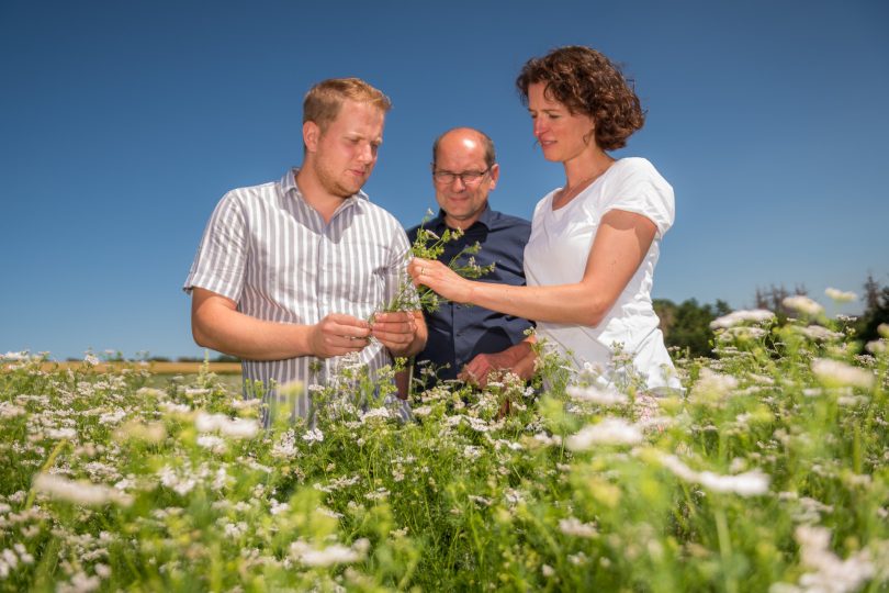 Die Köhlers haben bereits 1995 aus Überzeugung auf Bio umgestellt. Sie setzen auf Vielfalt und bauen 25 verschiedene Kulturen an Hackfrüchten, Leguminosen, Getreide und Kräutern auf 88 Hektar an, davon entfallen rund zwei Hektar auf den Koriander. Sie bewirtschaften ihre Flächen mit einer komplexen achtjährigen Fruchtfolge. Damit erhalten sie die Bodenfruchtbarkeit und kontrollieren auf natürliche die sogenannten Beikräuter, also insektenfreundlicher Ackerwildkräuter wie Kornblumen und Mohnblumen, die zwischen den Feldfrüchten wachsen. Dafür nehmen sie sogar wirtschaftliche Einbußen in Kauf, auf 25 Prozent der Flächen wächst als Gründünger und zur Bodenverbesserung immer Kleegras, das aber keine Einnahmen bringt.