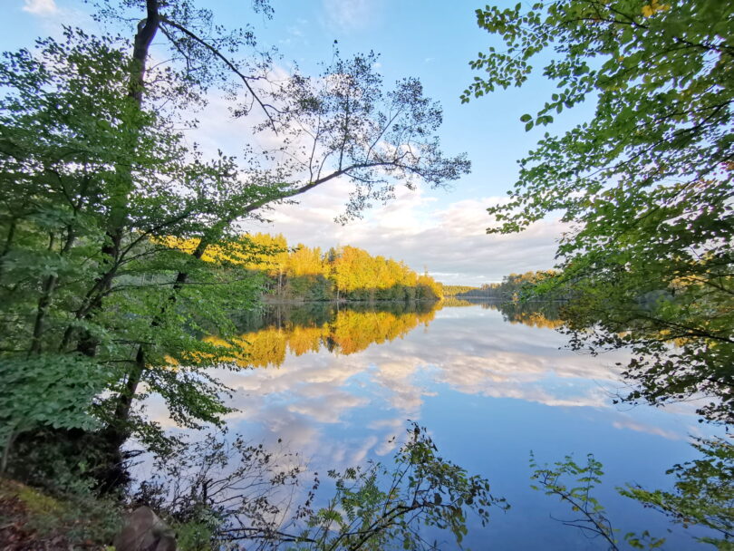 Gold-gelbe strahlende Bäume spiegeln sich im königs-blauen Wasser und dieses wiederum passt farblich zum leichten Gewölk.