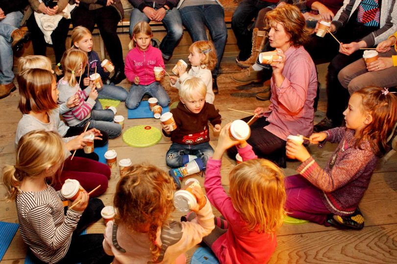 BHM_Orchtester Kunterbunt.jpg: Die Musikpädagogin Annette Wachinger begeistert mit Liedern und Geschichten die jüngsten Besucher. © Bezirk Oberbayern, Bauernhausmuseum Amerang, G.Nixdorf