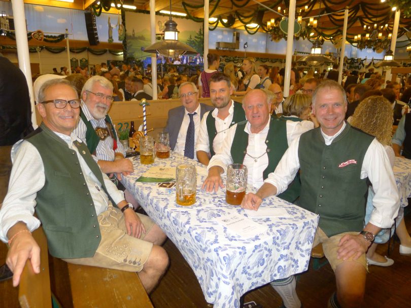 „Das Rosenheimer Herbstfest entspricht ganz den Vorstellungen der Vereinten Nationen, denn es verbindet Menschen und Länder auf friedliche und fröhliche Weise“ – mit diesen Worten kommentierte Vizepräsident Dr. Josef Siegele von der Vereinigung der UNO-Korrespondenten in Wien (UNCAV) seinen Besuch auf der Rosenheimer Wiesn. Eingeladen hierzu hatte in die Boxen der Auerbrauerei der Bayernbund mit seinem Landesvorsitzenden Sebastian Friesinger und mit dem Rosenheimer Kreisvorsitzenden Christian Glas. Unsere Aufnahme zeigt von links Auerbräu-Geschäftsführer Dirk Steinebach, Sebastian Friesinger, Dr. Josef Siegele, Marcel Glas, Christian Glas und Auerbräu-Braumeister Thomas Frank.