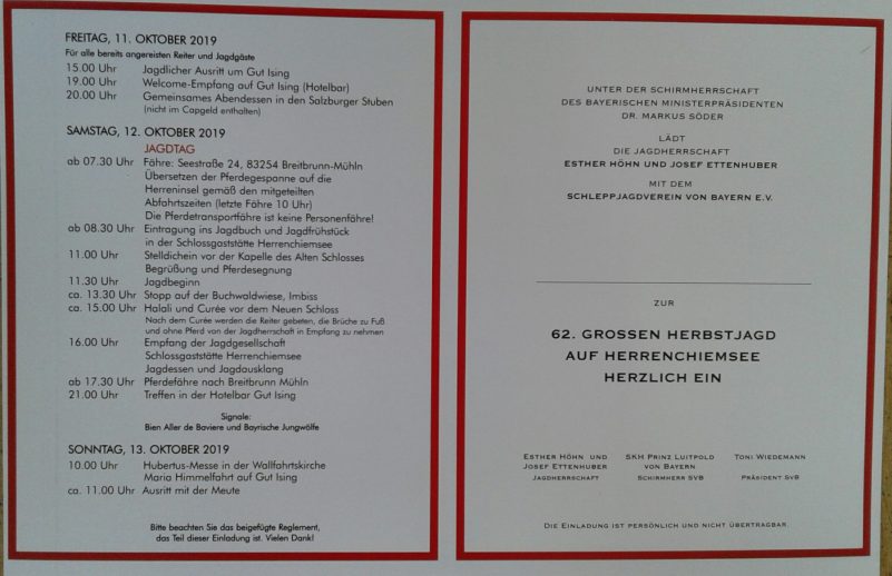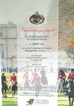 Für die Teilnehmer ist es ein sportlich anspruchsvoller Jagdtag auf geschichtsträchtigem Boden, für die alljährlich weit über tausend Zuschauer ein einzigartiges Erlebnis: Am 12. Oktober rufen auf der Herreninsel wieder die Jagdhörner. Aufgesessen wird zur 61. Großen Herbstjagd. 60 Reiter und 40 Hunde bilden das Jagdfeld. Das Geläuf, gut 20 Kilometer mit 35 Hindernissen, ist aufgeteilt in acht Schleppen (Etappen). Die Schleppjagd auf Herrenchiemsee steht rückwirkend und bis heute immer unter der Schirmherrschaft des Bayerischen Ministerpräsidenten.