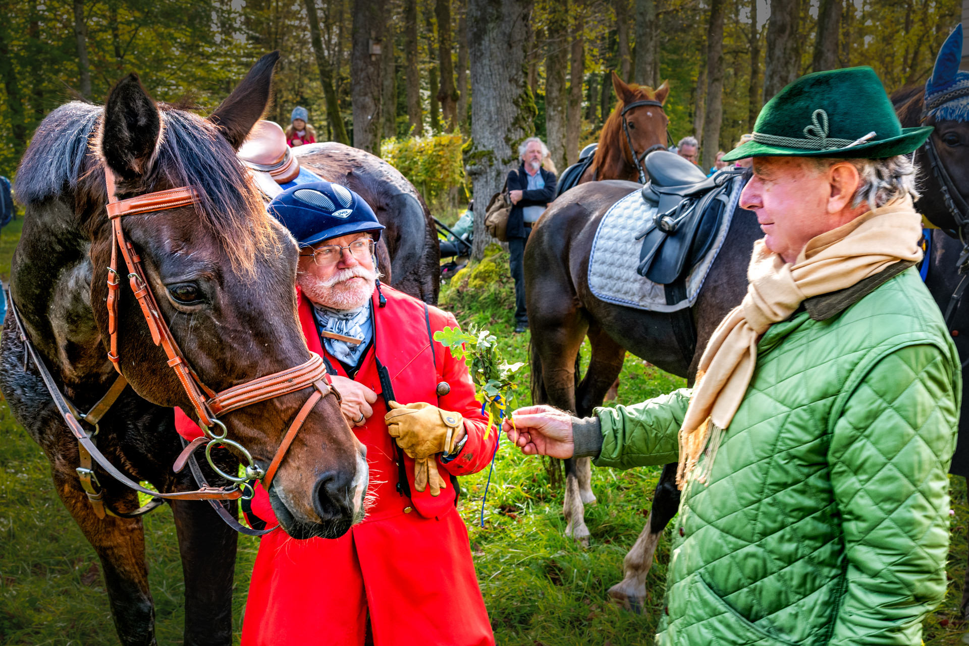 Der Jagdherr, Josef Ettenhuber, überreicht jedem Reiter einen sogenannten „Bruch“, ein Eichenlaub, als Zeichen, dass der Reiter die Jagd bis zum Ende mitgeritten ist.