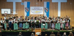 Den zweiten Teil des Konzertabends eröffnete die 50-köpfige, kraftvolle Blaskapelle unter der Leitung von Thomas Lindlacher mit dem „Astronautenmarsch“, welcher von Josef Ullrich komponiert wurde. Die Musikanten sicherten sich vom ersten Ton an die volle Aufmerksamkeit der vielen Konzertbesucher, die ein sehr diszipliniertes Blasorchester erlebten. Mit der Polka „Prager Gassen“ von Jaroslav Zeman erklangen im Anschluss flotte böhmische Melodien in der Überseer Turnhalle. Mit einer beeindruckenden und konzentrierten Leistung präsentierte die Blaskapelle die anspruchsvolle Melodienfolge aus dem Musical „Der Zauberer von Oz“ von Harold Arlen, wofür sie viel Beifall erhielten. Ebenfalls für Begeisterung sorgten der schwungvolle Marsch „Kaiserin Sissi“ von Timo Dellweg und der bekannte „Seufzer-Galopp“ von Johann Strauß Vater, bei dem die Musikanten das schnelle Galopp-Tempo übernahmen, sodass sie zum Ende des Stücks vor Anstrengung Seufzen mussten. Besonders gefühlvoll zeigte sich die Blaskapelle mit dem anmutigen „Schlittschuhläufer-Walzer“ (frz. Les Patineurs) von Emil Waldteufel. Zum Abschluss wurde schließlich das Medley „TV-Kultabend“ aufgelegt, dass das Publikum zum Erraten bekannter Titelmelodien, darunter z.B. “Lindenstraße”, „Schwarzwaldklinik“ und „Wetten, dass…?“, einlud. Natürlich durfte nach dem ausdauernden Applaus der Zuhörer die Zugabe nicht fehlen. Gespielt wurde der „Rainermarsch“, der als heimliche Landeshymne Salzburgs bekannt ist. Das Publikum konnte bei diesem Lied mitsingen. Auch einige Musikanten legten für zwei Strophen ihr Instrument beiseite und stimmten kräftig mit ein. Ein besonderes Highlight des Konzerts stellte die zweite Zugabe dar. Die rund 90 Musikanten aus der Jugendblaskapelle, des Erwachsenen-Ensembles und der Blaskapelle fanden sich gemeinsam auf der Bühne ein und spielten zum Abschluss den bekannten Schlagerhit „Sweet Caroline“ von Neil Diamond.