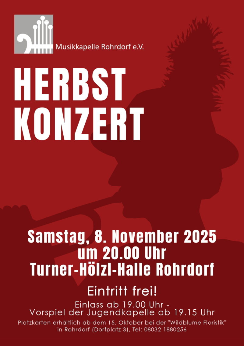 Am Samstag, 8. November findet um 20 Uhr das Herbstkonzert der Musikkapelle Rohrdorf in der Turner-Hölzl Halle statt, welches den offiziellen Abschluss des Festjahres (165 Jahre – klangVOLLESROHRdorf) darstellt. Musikliebhaber dürfen sich auf ein abwechslungsreiches Programm von Dirigent Christoph Danner freuen.