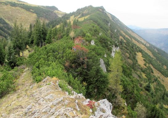 Weiter geht´s, anfangs relativ moderat, dann durch etwas steileres Gelände. Wir gelangen endlich in aussichtsreicheres Gebiet. Nach einigen Latschen- und Gras- Serpentinen endet der Pfad, bei einer Wegkreuzung. Wir kommen auf den Steig, der vom Geigelstein über die Roßalm herüber zum Weitlahner führt. Jetzt sind es nur noch 20 Minuten fast eben bis zum Gipfel, der bald in Sicht kommt.
