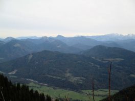 Am Weitlahnergipfel machen wir eine längere Rast. Wir sind alleine, sind auf dem ganzen Anstieg niemandem begegnet. Wir haben eine Brotzeit dabei, denn es gibt auf der ganzen Tour keine Einkehrmöglichkeit. Die Rundumsicht ist prächtig, von den Berchtesgadener Alpen über das Sonntagshorn, Hörndlwand, Wilden Kaiser, Aschentalerwände, bis hinüber zur Sonnwendwand mit der Hofbauernalm und zur Kampenwand. Auch zur Dalsenalm und nach Schleching sieht man hinunter, nur der Geigelstein ist nicht zu sehen.