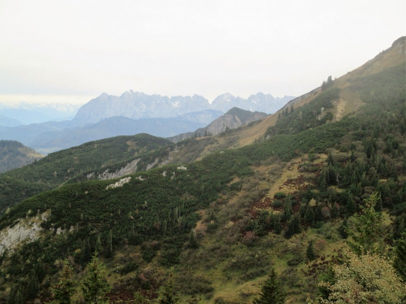 Wir starten im Ortszenrum von Schleching und wandern auf einem Forstweg zügig bergauf durch dichten Wald. Aussicht hat man kaum, der Indian Summer hat auch noch nicht so richtig Einzug gehalten. Es dauert heuer länger wie sonst bis die Blätter anfangen sich zu verfärben, denn der Sommer war recht nass. Heraus aus dem Wald stoßen wir auf den Almweg zur Haidenholzalm, wo wir eine Trinkpause mit Kirchweihkrapfen einlegen . Wir gehen über eine Lichtung , vorbei an der Haidenholzalm und können zur Haidenholzerschneid hinaufschauen. Der Weitlahner ist noch nicht zu sehen.