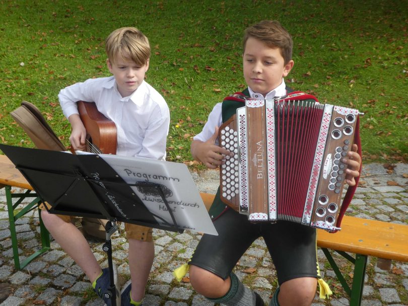 Wetterglück, Organisationsgeschick und Besucherfreuden trafen zusammen als der Musikförderverein von Wildenwart zu einem Herbstmarkt auf dem Platz vor dem Musikantenheim einlud und dabei eindrucksvoll zeigte, wie groß die musikalische Bandbreite innerhalb der Musikkapelle Wildenwart ist. Einen ganzen schönen Tag über ließen sich abwechselnd fünf Mitglieder der Bläserklasse Frasdorf, 28 Dirndl und Buam der Zwergerlmusi, 26 Nachwuchsmusikanten der Jugendblaskapelle, die mit fünf Musikanten besetzte Liabeberg-Musi sowie die Ganz-Oafach-Musi aus den Reihen der Erwachsenen hören. Die musikalische Gesamtleitung hatte an diesem Tag Eva-Maria Gruber, sie wurde unterstützt von Fördervereins-Vorsitzenden Jakob Steiner, dem wiederum bei der Bewirtung im kleinen Festzelt und im Freien von weiteren Mitgliedern des Vereins und von Festwirt Richard Grosse geholfen wurde. Am Kaffee- und Kuchenstand spielten auch Einzelschüler in kleiner Besetzung auf. Abgerundet wurde das Marktangebot von Handwerker-Vorführungen sowie von Verkaufsständen mit herbstlichen Produkten und mit Gestricktem. Zur Mittagsstunde begaben sich die Musikanten und Besucher zu einem Mittagsgebet in die nahe Pfarrkirche Christkönig, um dort mit zwei Weisen und Stille innezuhalten. Die nächste Veranstaltung der Musikkapelle Wildenwart ist am Samstag, 20. Oktober das Jahreskonzert in der Lamstoahalle Frasdorf, das um 19 Uhr mit den Nachwuchsgruppen beginnt und ab 20 Uhr von der Erwachsenen-Kapelle gestaltet wird. Für dieses Konzert gibt es ab sofort unter der Telefon-Nummer 08051-9616477 die Möglichkeit einer Platzreservierung (Programm siehe www.musikkapelle-wildenwart.de).