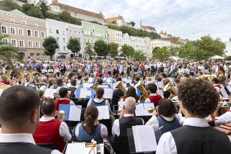 Bericht: Stadt Burghausen / Foto: Wacker Chemiee AG – Auch in diesem Jahr hoffen die Musiker der WACKER Werkkapelle mit ihren Gästen, der Musikkapelle Fridolfing, auf trockenes Wetter und zahlreiche Besucher am Stadtplatz. (Foto von 2023)