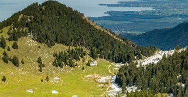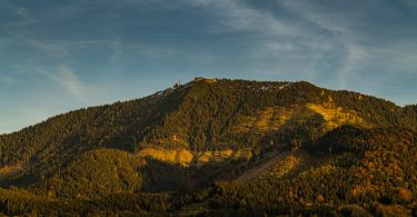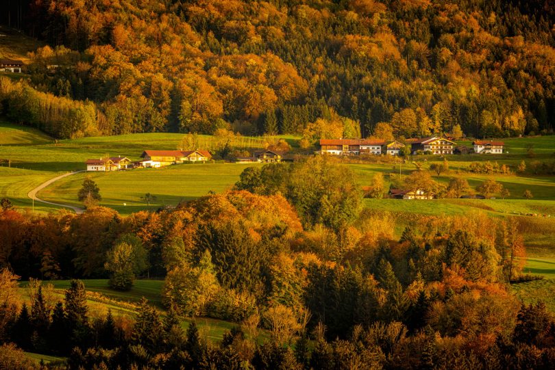 Rundherum eingebettet von herbstfarbenen Wäldern zeigt sich in diesen Tagen im Abendlicht der Ort Schweinsteig am Samerberg. Schweinsteig ist einer von 74 Orten oder Weilern der Gemeinde Samerberg und ist zu finden auf dem Weg von Grainbach in Richtung Duft mit dem dortigen Berggasthof Duftbräu.