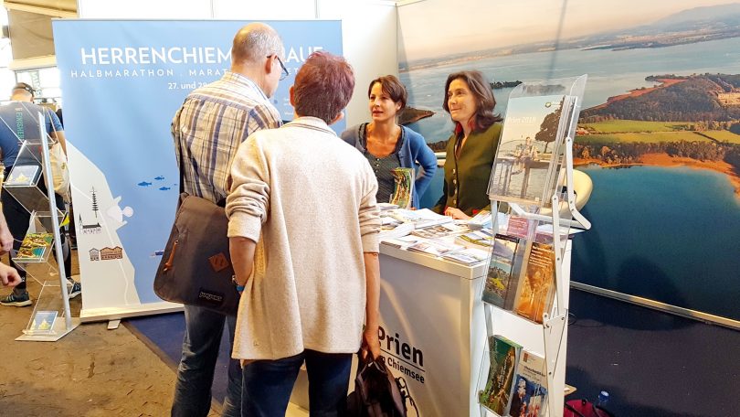 Am Freitag, 12. und Samstag, 13. Oktober 2018 war die Olympiahalle im Rahmen des München Marathon Schauplatz der GMM Sportmesse München. Auf über 3.000 Quadratmetern präsentierten zahlreiche Unternehmen und Dienstleister ihre breit gefächerten Produkte aus den Bereichen Running und Ausrüstung, Running und Tourismus, Sporternährung, Health und Fitness, Wellness und Lifestyle sowie Sportliteratur und Sport im Web. Eine vielbesuchte Anlaufstelle war der Messestand von der München Marathon GmbH und der Prien Marketing GmbH, die gemeinsam und mit Unterstützung der Bayerischen Schlösser- und Seenverwaltung am letzten Aprilwochenende 2019 ein neues Laufevent veranstalten: den Herrenchiemsee-Lauf. Nach zwei geschäftigen Tagen blicken die beiden Aussteller auf einen erfolgreichen Messeauftritt zurück – die rund 22.000 Teilnehmer des Generali München Marathon und deren Angehörige sowie sportlich Interessierte wurden über den Zwei-Etappen-Marathon am Chiemsee und das touristische Freizeit- und Übernachtungsangebot in Prien informiert. Im Laufschritt um die Herreninsel genießen Ausdauersportler den Blick auf das Königsschloss, den Chiemsee und die bayerischen Berge: „Eine tolle Strecke, darauf haben wir schon lange gewartet“, so das Resümee vieler Laufsportbegeisterter am Messestand. Die Priener Blaskapelle sorgte am zweiten Messetag beim Start zum „Internationalen Trachtenlauf“ für die musikalische Unterhaltung der Besucher und auch die beiden Auftritte der Priener Goaßlschnalzer begeisterten das Publikum, die mit ihren Schlägen zum Rhythmus der Musik den Generali München Marathon offizielle eröffneten.