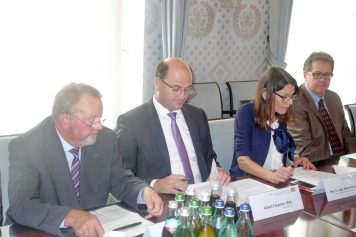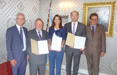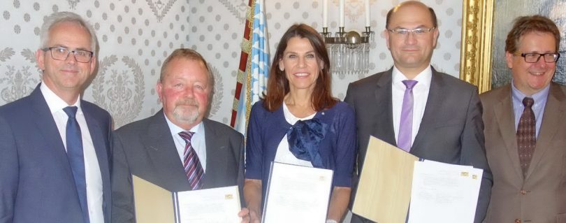 Foto/s: Hötzelsperger – 1. Vertragsunterzeichnung in München von links: Stv. Landrat Josef Huber, Finanzminister Albert Füracker, Kunstministerin Prof. Dr. Marion Kiechle und Direktor Dr. Richard Loibl vom Haus der Bayerischen Geschichte.