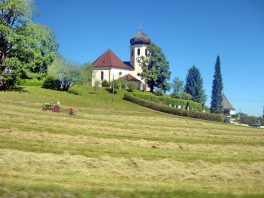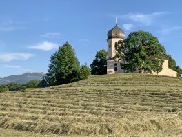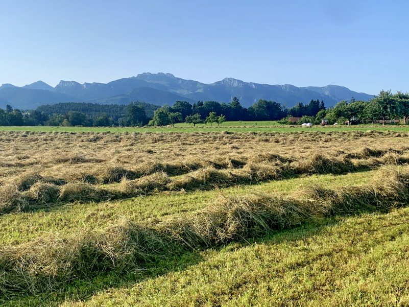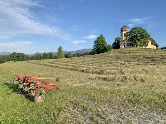 Einladend schön war das Sommerwetter in diesen Tagen für die Einbringung der heurigen Heuernte. Nach getaner Tages-Feldarbeit zeigten sich Felder und Landschaft –wie hier mit der Pfarrkirche „Christkönig“ von Wildenwart und mit der Kampenwand- in friedlicher Ruhe und froher Erwartung auf den folgenden Erntetag. Doch in der Nacht bereits einsetzender Regen machte die Pläne zunichte und die Heu-Heimfahrt muss noch warten.